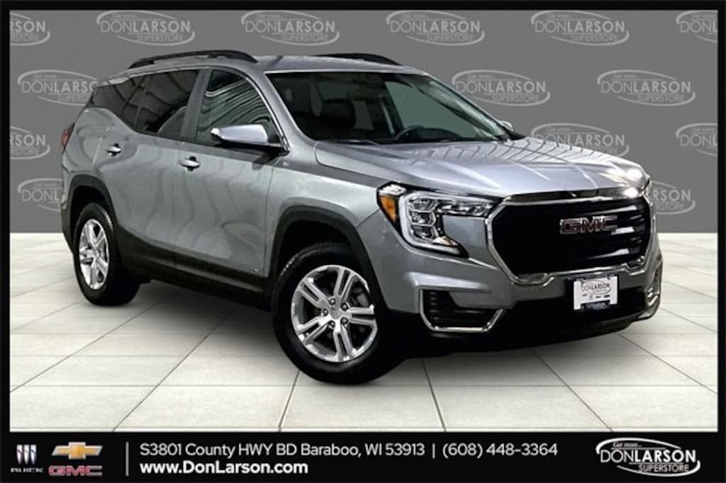 Recent Arrival! Bluetooth, Hands Free, Local Trade, One Owner, GM Certified, Remote Start, Backup Camera, Heated Seats, Portable Audio Connection, Power Locks, Power Windows, AWD / 4WD / 4X4, GMC Certified Pre-Owned Certified, AWD, 2 USB Data Ports w/Auxiliary Input Jack, 3.47 Axle Ratio, 4-Way Manual Driver's Seat, 4-Way Manual Front Passenger Seat, 4-Wheel Disc Brakes, 4.2 Multi-Color Driver Information Screen, 6 Speakers, 6-Speaker Audio System Feature, 8-Way Power Driver Seat Adjuster, ABS brakes, Air Conditioning, Alloy wheels, AM/FM radio: SiriusXM, Auto High-beam Headlights, Auto-dimming Rear-View mirror, Bluetooth® For Phone, Brake assist, Bumpers: body-color, Cold Air Grille Shutter, Compass, Delay-off headlights, Driver & Front Passenger Heated Seats, Driver Convenience Package, Driver door bin, Driver vanity mirror, Dual front impact airbags, Dual front side impact airbags, Dual-Zone Automatic Climate Control, Electronic Stability Control, Emergency communication system: OnStar and GMC connected services capable, Four wheel independent suspension, Front anti-roll bar, Front Bucket Seats, Front Center Armrest, Front reading lights, Fully automatic headlights, Heated door mirrors, Illuminated entry, Lane Departure Warning System, License Plate Front Mounting Package, Low tire pressure warning, Occupant sensing airbag, Outside temperature display, Overhead airbag, Overhead console, Panic alarm, Passenger door bin, Passenger vanity mirror, Power door mirrors, Power Driver Lumbar Control, Power Programmable Rear Liftgate, Power steering, Power windows, Preferred Equipment Group 3SA, Premium Cloth Seat Trim, Radio data system, Radio: GMC Infotainment Audio System w/7 Display, Rear anti-roll bar, Rear seat center armrest, Rear window defroster, Rear window wiper, Remote keyless entry, Remote Start, Roof-Mounted Luggage Rack Side Rails, Security system, SiriusXM Radio, Speed control, Speed-sensing steering, Split folding rear seat, Spoiler, Steering wheel mounted audio controls, Tachometer, Telescoping steering wheel, Tilt steering wheel, Traction control, Trip computer, Variably intermittent wipers, Wheels: 17 x 7 Silver Painted Aluminum, Wireless Apple CarPlay/Wireless Android Auto, AWD. Certified. Clean CARFAX. CARFAX One-Owner.JUST GET MORE AT THE DON LARSON SUPERCENTER! Proudly servicing Baraboo, Wisconsin Dells, Portage, North Freedom, Middleton, Madison, Mauston, Lodi, Lake Delton, Waunakee, De Forest, Sun Prairie, and Reedsburg!Please call today to schedule your test drive on this ... 2023 GMC Terrain SLE 1.5L DOHC Sterling Metallic