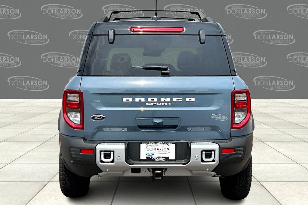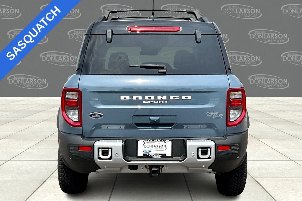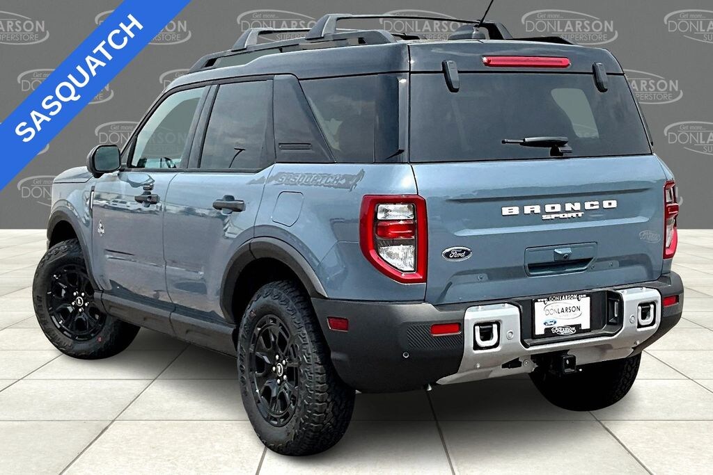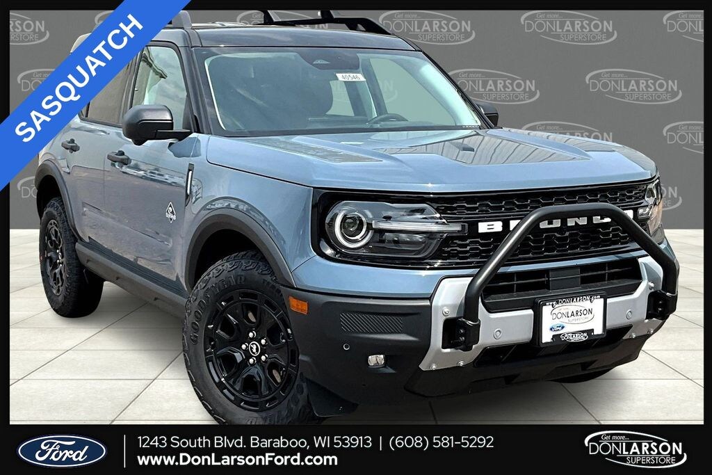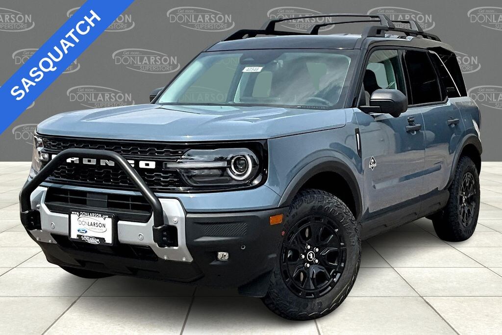 Azure Gray Metallic Tri-Coat 110V/400W AC Power Outlet, 2nd Row Carpeted Seatback, 360-Degree Camera w/Trail & Split View, 4-Wheel Disc Brakes, 6 Speakers, ABS brakes, Air Conditioning, Alloy wheels, AM/FM radio: SiriusXM, AM/FM Stereo, Auto High-beam Headlights, Auto-dimming Rear-View mirror, Automatic temperature control, Auxiliary Switches & Wiring, B&O Sound System by Bang & Olufsen, Brake assist, Brush Guard, Class II Trailer Tow Pack w/Trailer Sway Control, Compass, Connected Navigation, Delay-off headlights, Driver door bin, Driver vanity mirror, Dual front impact airbags, Dual front side impact airbags, Electronic Stability Control, Emergency communication system: SYNC 4 911 Assist, Equipment Group 300A, Fender Tie Downs, Four wheel independent suspension, Front & Rear Black Bumpers, Front & Rear Floor Liners w/o Carpet Mats, Front anti-roll bar, Front Bucket Seats, Front Center Armrest, Front Driver/Passenger Seat Back Map Pockets, Front dual zone A/C, Front fog lights, Front License Plate Bracket, Front Parking Sensors, Front reading lights, Fully automatic headlights, Garage door transmitter, HD Radio, Heated door mirrors, Heated front seats, Heated steering wheel, High Clearance Fender Flares, HOSS 2.0 Off-Road Suspension, Illuminated entry, Interior Grab Handle, Knee airbag, Low tire pressure warning, Memory seat, Occupant sensing airbag, Outer Banks Tech Package+, Outside temperature display, Overhead airbag, Overhead console, Panic alarm, Passenger door bin, Passenger vanity mirror, Power door mirrors, Power driver seat, Power passenger seat, Power steering, Power windows, Premium Trimmed Front Bucket Seats w/Ebony/Roast, Radio data system, Rain sensing wipers, Rear anti-roll bar, Rear Parking Sensors, Rear reading lights, Rear seat center armrest, Rear window defroster, Rear window wiper, Recovery Hooks, Remote keyless entry, Reverse Brake Assist, Sasquatch Graphic Package, Sasquatch Outer Banks Package, Security system, SiriusXM, Speed control, Speed-sensing steering, Speed-Sensitive Wipers, Split folding rear seat, Steering wheel mounted audio controls, SYNC 4 w/Enhanced Voice Recognition, Tachometer, Telescoping steering wheel, Tilt steering wheel, Traction control, Trail Control for Off-Road, Trip computer, Variably intermittent wipers, Wheels: 17" Ebony Black-Painted Aluminum, Wheels: 18" Ebony Black-Painted Aluminum. 25/30 City/Highway MPG 2025 Ford Bronco Sport Outer Banks 4WD 8-Speed Automatic 1.5L EcoBoost