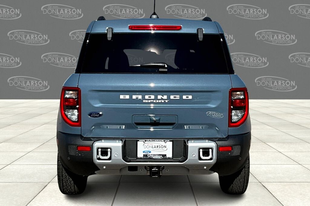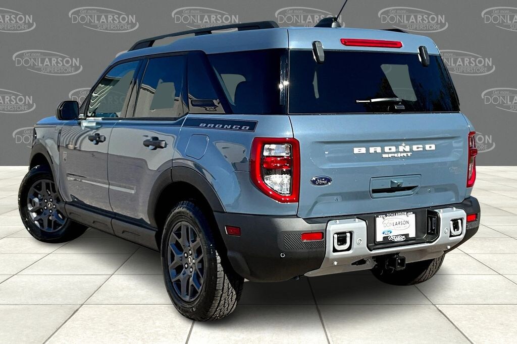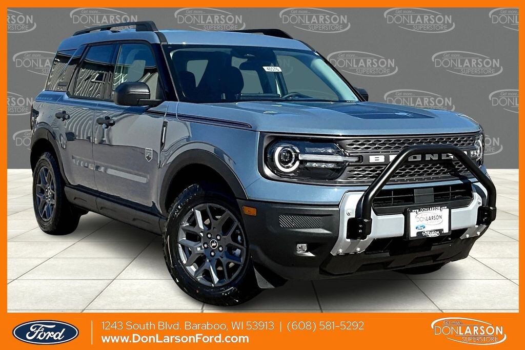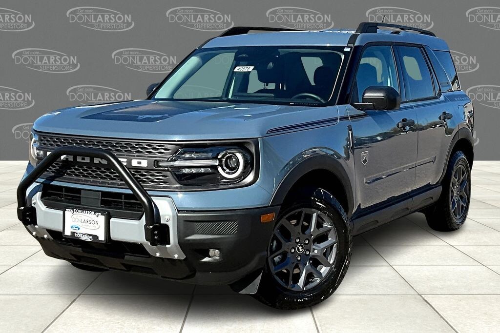 Azure Gray Metallic Tri-Coat 4-Wheel Disc Brakes, 6 Speakers, ABS brakes, Air Conditioning, Alloy wheels, AM/FM radio: SiriusXM, AM/FM Stereo, Auto High-beam Headlights, Automatic temperature control, Brake assist, Cloth w/Easy-to-Clean Front Bucket Seats, Compass, Delay-off headlights, Driver door bin, Driver vanity mirror, Dual front impact airbags, Dual front side impact airbags, Electronic Stability Control, Emergency communication system: SYNC 4 911 Assist, Four wheel independent suspension, Front anti-roll bar, Front Bucket Seats, Front Center Armrest, Front reading lights, Fully automatic headlights, Heated door mirrors, Illuminated entry, Knee airbag, Low tire pressure warning, Occupant sensing airbag, Outside temperature display, Overhead airbag, Overhead console, Panic alarm, Passenger door bin, Passenger vanity mirror, Power door mirrors, Power steering, Power windows, Radio data system, Rear anti-roll bar, Rear Parking Sensors, Rear reading lights, Rear seat center armrest, Rear window defroster, Rear window wiper, Remote keyless entry, Security system, SiriusXM, Speed control, Speed-sensing steering, Speed-Sensitive Wipers, Split folding rear seat, Steering wheel mounted audio controls, SYNC 4 w/Enhanced Voice Recognition, Tachometer, Telescoping steering wheel, Tilt steering wheel, Traction control, Trip computer, Variably intermittent wipers, Wheels: 17" Carbonized Gray-Painted Aluminum. 25/30 City/Highway MPG 2025 Ford Bronco Sport Big Bend 4WD 8-Speed Automatic 1.5L EcoBoost
