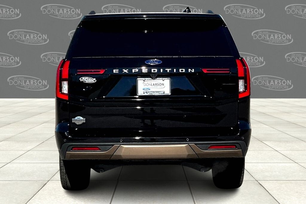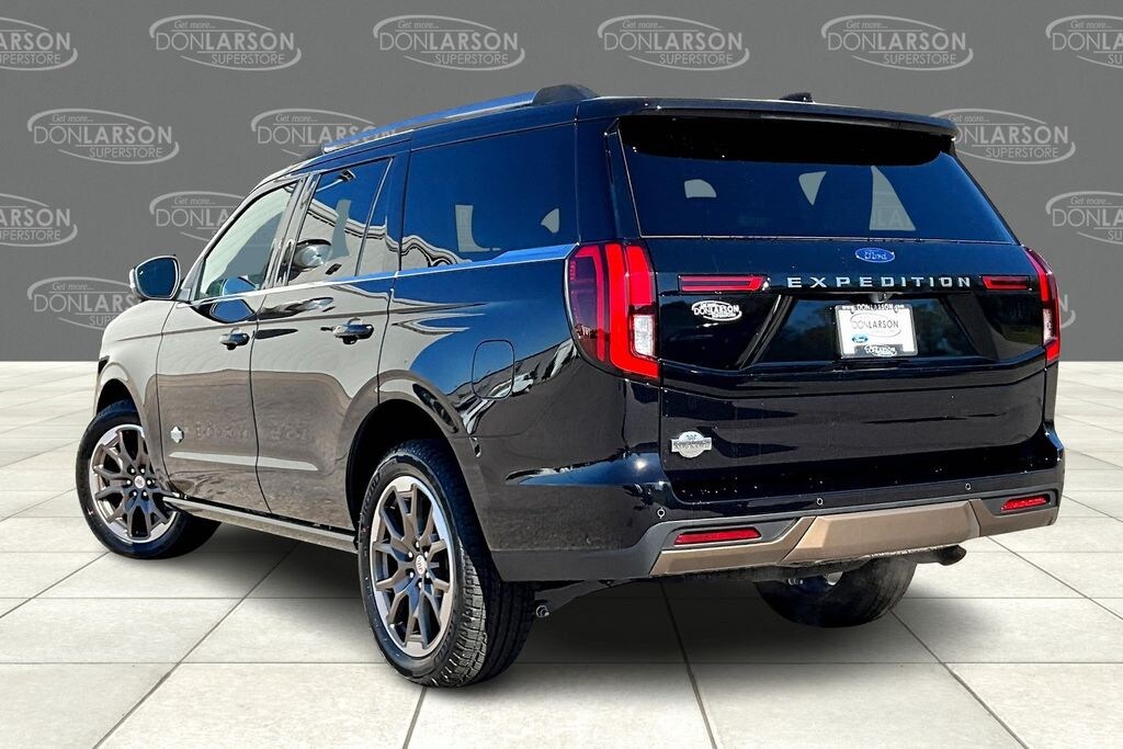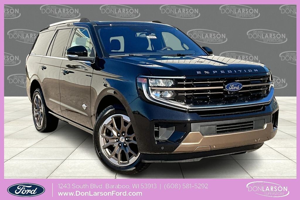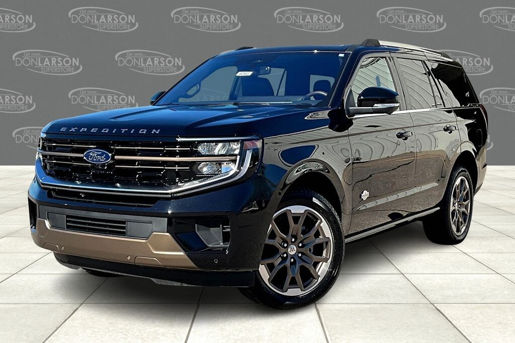 Recent Arrival! Agate Black Metallic 4WD, 22 Speakers, 3.73 Axle Ratio, 3rd row seats: split-bench, 4-Wheel Disc Brakes, ABS brakes, Adaptive suspension, Adjustable pedals, Air Conditioning, Alloy wheels, AM/FM radio: SiriusXM with 360L, Apple CarPlay/Android Auto, Auto High-beam Headlights, Auto-dimming door mirrors, Auto-dimming Rear-View mirror, Automatic temperature control, BlueCruise Equipped (1-Year Plan), Brake assist, Bumpers: body-color, Compass, Delay-off headlights, Driver door bin, Driver vanity mirror, Dual front impact airbags, Dual front side impact airbags, Electronic Stability Control, Emergency communication system: 911 Assist, Exterior Parking Camera Rear, Four wheel independent suspension, Front anti-roll bar, Front Bucket Seats, Front Center Armrest, Front dual zone A/C, Front reading lights, Fully automatic headlights, Garage door transmitter, Genuine wood dashboard insert, Genuine wood door panel insert, Heated door mirrors, Heated front seats, Heated rear seats, Heated steering wheel, Heated/Vent Prem Del Rio Lthr Fr Captain's Chairs, Illuminated entry, Leather steering wheel, Low tire pressure warning, Memory seat, Navigation System, Occupant sensing airbag, Outside temperature display, Overhead airbag, Overhead console, Panic alarm, Passenger door bin, Passenger vanity mirror, Pedal memory, Power door mirrors, Power driver seat, Power moonroof: Vista Roof, Power passenger seat, Power steering, Power windows, Radio data system, Radio: B&O Unleashed Sound System by Bang & Olufsen, Rain sensing wipers, Rear air conditioning, Rear anti-roll bar, Rear reading lights, Rear window defroster, Rear window wiper, Reclining 3rd row seat, Remote keyless entry, Security system, SiriusXM w/360L, Speed control, Speed-sensing steering, Speed-Sensitive Wipers, Split folding rear seat, Spoiler, Steering wheel memory, Steering wheel mounted audio controls, Tachometer, Telescoping steering wheel, Tilt steering wheel, Traction control, Trip computer, Turn signal indicator mirrors, Variably intermittent wipers, Ventilated front seats, Voltmeter, Wheels: 22" Sinister Brown w/Diamond Cut Face Alum, 4WD. 2025 Ford Expedition King Ranch 4WD 10-Speed Automatic EcoBoost 3.5L V6 GTDi DOHC 24V Twin Turbocharged