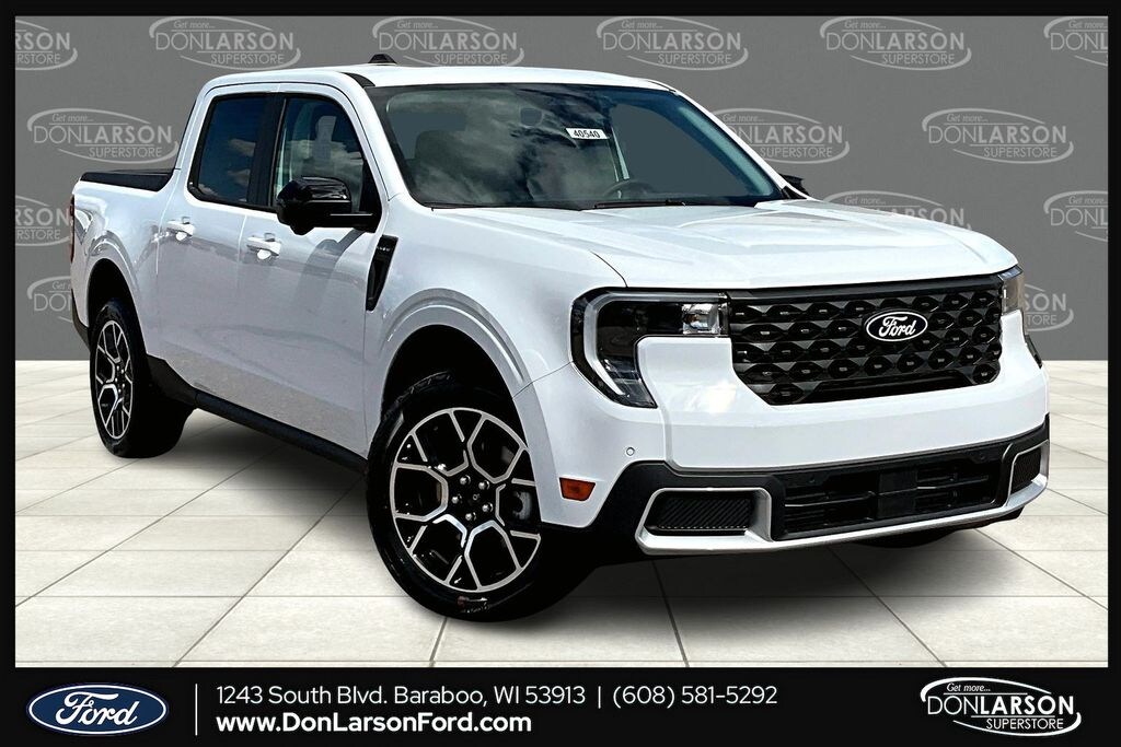 Oxford White 2.91 Axle Ratio, 4-Wheel Disc Brakes, 4K Tow Package, 8 Speakers, ABS brakes, ActiveX Trimmed Heated Front Bucket Seats, Air Conditioning, Alloy wheels, AM/FM radio: SiriusXM with 360L, Apple CarPlay/Android Auto, Auto High-beam Headlights, Automatic temperature control, Brake assist, Bumpers: body-color, Compass, Delay-off headlights, Driver door bin, Driver vanity mirror, Dual front impact airbags, Dual front side impact airbags, Electronic Stability Control, Emergency communication system: SYNC 4 911 Assist, Equipment Group 502A, Exterior Parking Camera Rear, Four wheel independent suspension, Front anti-roll bar, Front Bucket Seats, Front Center Armrest, Front dual zone A/C, Front reading lights, Fully automatic headlights, Heated door mirrors, Heated front seats, Heated steering wheel, Illuminated entry, Knee airbag, Low tire pressure warning, Navigation system: Connected Navigation, Occupant sensing airbag, Outside temperature display, Overhead airbag, Overhead console, Panic alarm, Passenger door bin, Passenger vanity mirror, Power door mirrors, Power driver seat, Power Moonroof, Power steering, Power windows, Radio data system, Radio: B&O Sound System by Bang & Olufsen, Rear anti-roll bar, Rear seat center armrest, Rear step bumper, Remote keyless entry, Security system, SiriusXM w/360L, Speed control, Speed-sensing steering, Steering wheel mounted audio controls, SYNC 4 w/Enhanced Voice Recognition, Telescoping steering wheel, Tilt steering wheel, Traction control, Trailer Brake Controller, Trailer Hitch (Class III) 2" Receiver, Transmission Oil Cooler, Trip computer, Upgraded Cooling Fan, Wheels: 19" Machined Painted Aluminum. 22/30 City/Highway MPG 2025 Ford Maverick Lariat AWD 8-Speed Automatic EcoBoost 2.0L I4 GTDi DOHC Turbocharged VCT