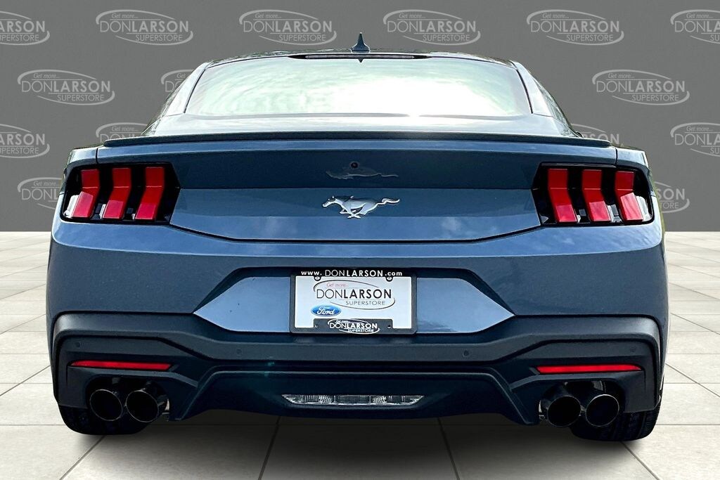 Vapor Blue Metallic 4-Wheel Disc Brakes, ABS brakes, Active Valve Performance Exhaust, Air Conditioning, Alloy wheels, AM/FM Stereo, Auto High-beam Headlights, Automatic temperature control, Brake assist, Bumpers: body-color, Compass, Delay-off headlights, Driver door bin, Driver vanity mirror, Dual front impact airbags, Dual front side impact airbags, Electronic Stability Control, Emergency communication system: 911 Assist, Exterior Parking Camera Rear, Four wheel independent suspension, Front anti-roll bar, Front Bucket Seats, Front Center Armrest, Front dual zone A/C, Front reading lights, Fully automatic headlights, Illuminated entry, Knee airbag, Leather Shift Knob, Low tire pressure warning, Occupant sensing airbag, Outside temperature display, Overhead airbag, Overhead console, Panic alarm, Passenger door bin, Passenger vanity mirror, Power door mirrors, Power steering, Power windows, Radio data system, Rain sensing wipers, Rear anti-roll bar, Rear Parking Sensors, Rear window defroster, Remote keyless entry, Speed control, Speed-sensing steering, Speed-Sensitive Wipers, Split folding rear seat, Sport steering wheel, Steering wheel mounted audio controls, SYNC 4, Tachometer, Telescoping steering wheel, Tilt steering wheel, Traction control, Trip computer, Variably intermittent wipers, Voltmeter, Wheel & Stripe Package, Wheels: 18" x 8" Machined-Face Aluminum, Wheels: 19" x 8.5" Machined-Face Aluminum. 21/32 City/Highway MPG 2025 Ford Mustang EcoBoost Premium RWD 10-Speed Automatic EcoBoost 2.3L I4 GTDi DOHC Turbocharged VCT