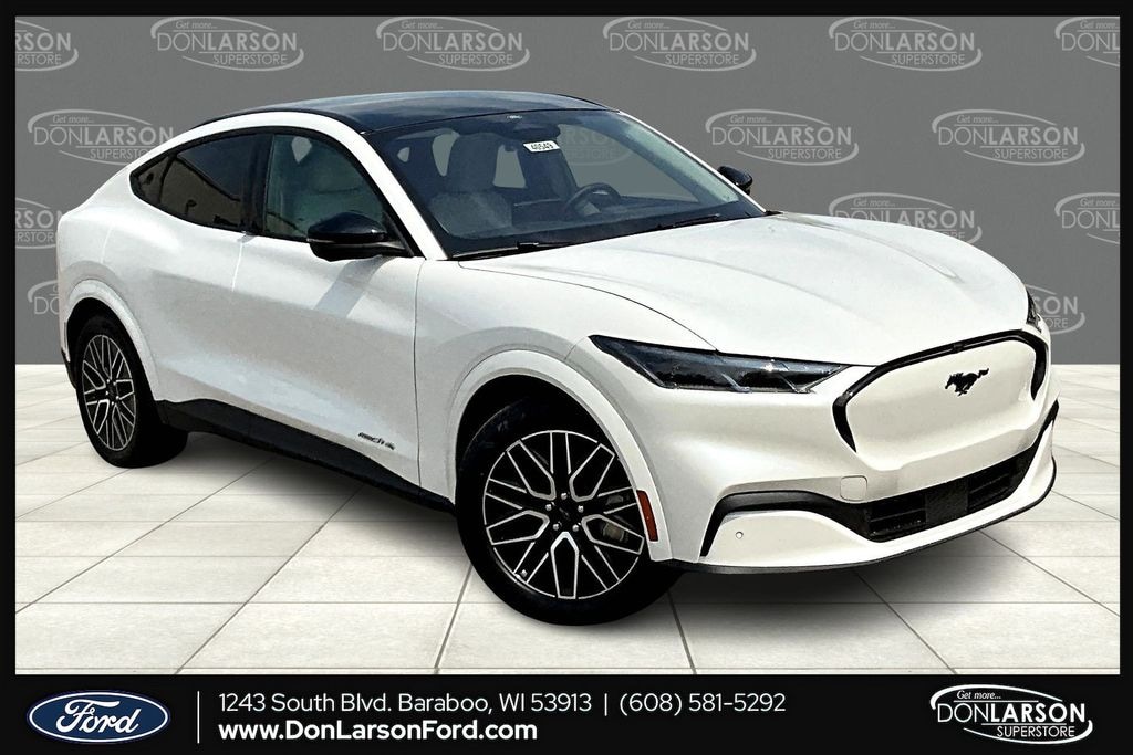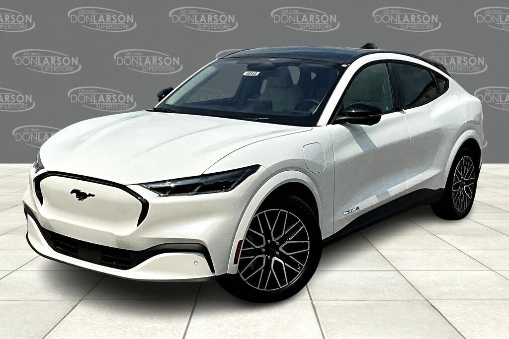 Star White Metallic Tri-Coat 10 Speakers, 4-Wheel Disc Brakes, ABS brakes, Air Conditioning, Alloy wheels, AM/FM radio: SiriusXM with 360L, Apple CarPlay/Android Auto, Auto High-beam Headlights, Auto-dimming Rear-View mirror, Automatic temperature control, Brake assist, Bumpers: body-color, Compass, Delay-off headlights, Driver door bin, Driver vanity mirror, Dual front impact airbags, Dual front side impact airbags, Electronic Stability Control, Emergency communication system: 911 Assist, Equipment Group 300A Standard Package, Exterior Parking Camera Rear, Four wheel independent suspension, Front anti-roll bar, Front Bucket Seats, Front Center Armrest, Front dual zone A/C, Front License Plate Bracket, Front reading lights, Fully automatic headlights, Garage door transmitter, Heated door mirrors, Heated front seats, Heated steering wheel, Heated/Ventilated Perforated ActiveX Bucket Seats, Illuminated entry, Knee airbag, Low tire pressure warning, Memory seat, Mobile Power Cord (120V/240V), Navigation system: Connected Navigation, Occupant sensing airbag, Outside temperature display, Overhead airbag, Overhead console, Panic alarm, Panoramic Fixed-Glass Roof, Passenger door bin, Passenger vanity mirror, Power door mirrors, Power driver seat, Power Liftgate, Power passenger seat, Power steering, Power windows, Radio data system, Radio: B&O Sound System by Bang & Olufsen, Rain sensing wipers, Rear anti-roll bar, Rear seat center armrest, Rear side impact airbag, Rear window defroster, Rear window wiper, Remote keyless entry, Security system, SiriusXM w/360L, Speed control, Speed-sensing steering, Speed-Sensitive Wipers, Split folding rear seat, Spoiler, Steering wheel mounted audio controls, SYNC 4A w/Enhanced Voice Recognition, Telescoping steering wheel, Tilt steering wheel, Traction control, Trip computer, Turn signal indicator mirrors, Variably intermittent wipers, Ventilated front seats, Wheels: 19" Bright Machined-Face Aluminum. 103/94 City/Highway MPG 2025 Ford Mustang Mach-E Premium AWD Single-Speed Automatic Dual Electric Motor