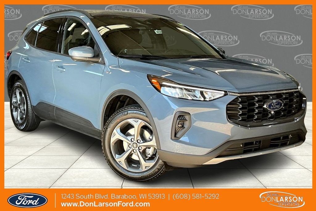 Vapor Blue Metallic 2.5L iVCT, 2.91 Axle Ratio, 4-Wheel Disc Brakes, 6 Speakers, ABS brakes, Air Conditioning, Alloy wheels, AM/FM radio: SiriusXM, AM/FM Stereo, Auto High-beam Headlights, Automatic temperature control, Brake assist, Bumpers: body-color, Compass, Delay-off headlights, Driver door bin, Driver vanity mirror, Dual front impact airbags, Dual front side impact airbags, Electronic Fuel Door Release, Electronic Stability Control, Emergency communication system: SYNC 4 911 Assist, Ford App, Four wheel independent suspension, Front anti-roll bar, Front Bucket Seats, Front Center Armrest, Front dual zone A/C, Front fog lights, Front reading lights, Fully automatic headlights, Heated door mirrors, Heated front seats, Heated steering wheel, Heated Vinyl/Cloth Front Sport Contour Bucket Seats, Illuminated entry, Knee airbag, Low tire pressure warning, Neutral Towing Capability, Occupant sensing airbag, Outside temperature display, Overhead airbag, Overhead console, Panic alarm, Passenger door bin, Passenger vanity mirror, Pedestrian Alert Sounder, Power door mirrors, Power driver seat, Power Liftgate, Power steering, Power windows, Radio data system, Rear anti-roll bar, Rear reading lights, Rear seat center armrest, Rear window defroster, Rear window wiper, Remote keyless entry, Speed control, Speed-sensing steering, Speed-Sensitive Wipers, Split folding rear seat, Spoiler, Sport steering wheel, Steering wheel mounted audio controls, SYNC 4, Tachometer, Telescoping steering wheel, Tilt steering wheel, Traction control, Trip computer, Variably intermittent wipers, Wheels: 18" Rock Metallic Painted Aluminum, 2.5L iVCT. 2026 Ford Escape Hybrid ST-Line Select AWD eCVT 2.5L iVCT