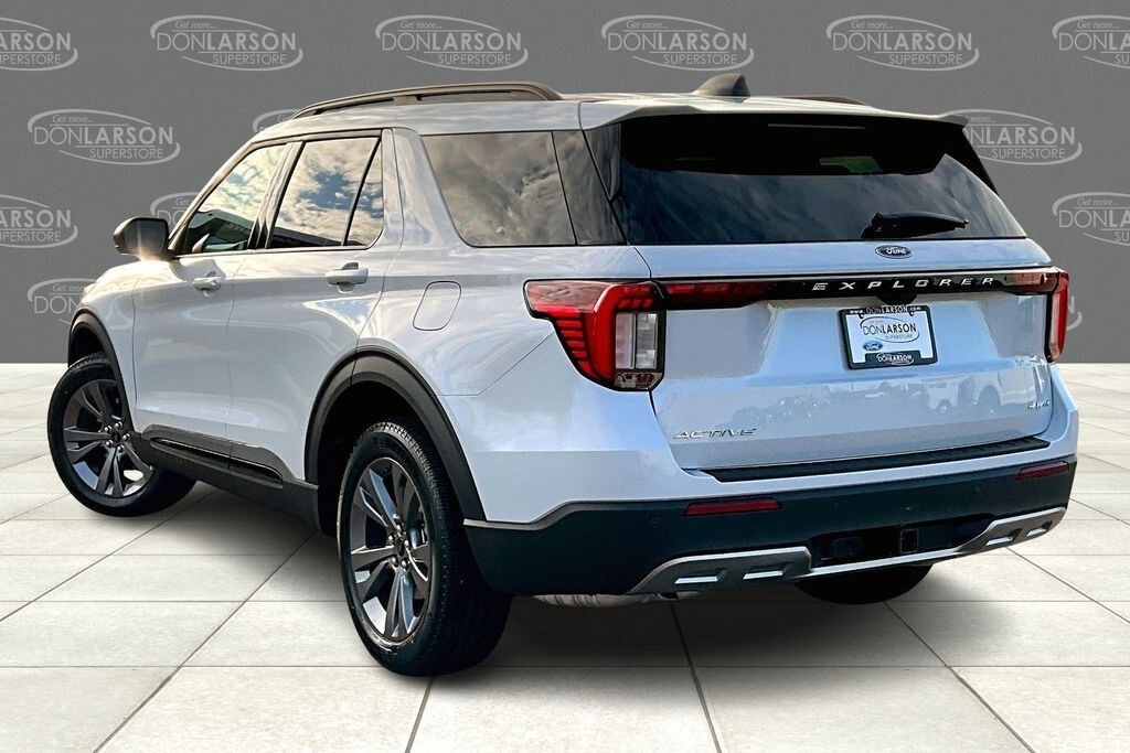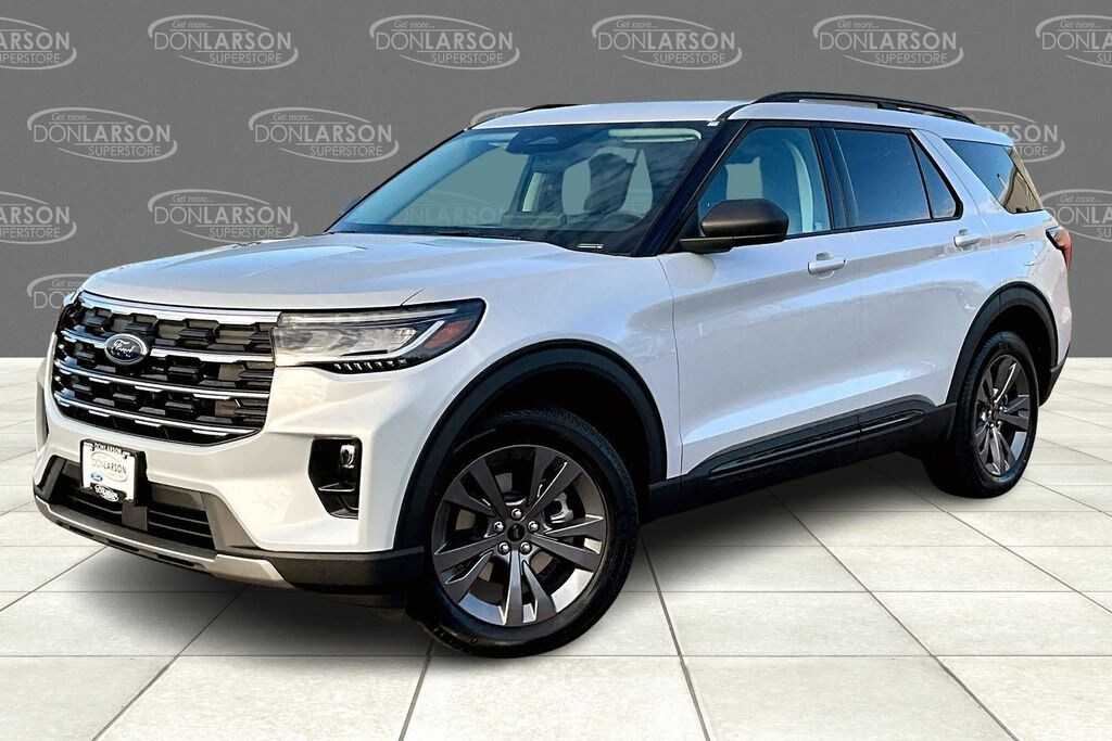 Space White Metallic 4WD, 3rd row seats: bench, 4-Wheel Disc Brakes, 6 Speakers, 8 USB Ports, ABS brakes, Active Badging, Active Comfort Package, Active Noise Cancellation, Air Conditioning, Alloy wheels, AM/FM radio: SiriusXM with 360L, AM/FM Stereo, Apple CarPlay/Android Auto, Auto High-beam Headlights, Automatic temperature control, Black Lower Bodyside Cladding with Chrome Accent, Black Roof-Rack Side Rails, Brake assist, Bumpers: body-color, Compass, Delay-off headlights, Driver door bin, Driver vanity mirror, Dual front impact airbags, Dual front side impact airbags, Electronic Stability Control, Emergency communication system: 911 Assist, Equipment Group 200A Standard Package, Exterior Parking Camera Rear, Four wheel independent suspension, Front and 2nd Rows Floor Liners with Carper Floor Mats, Front anti-roll bar, Front Bucket Seats, Front Center Armrest, Front dual zone A/C, Front Fascia, Front License Plate Bracket, Front reading lights, Fully automatic headlights, Heated ActiveX Seating Material Captain's Chairs, Heated door mirrors, Heated Steering Wheel, Illuminated entry, Internet access capable: FordPass Connect 5G, Knee airbag, Low tire pressure warning, Manual-Folding Sideview Mirrors, Navigation System, Occupant sensing airbag, Outside temperature display, Overhead airbag, Overhead console, Panic alarm, Panoramic Fixed Glass Roof with Power Shade, Passenger door bin, Passenger vanity mirror, Power driver seat, Power Liftgate, Power steering, Power windows, Rear air conditioning, Rear anti-roll bar, Rear reading lights, Rear window defroster, Rear window wiper, Remote keyless entry, Remote Start System, Second Row Hvac Controls, Security system, Speed control, Speed-sensing steering, Speed-Sensitive Wipers, Split folding rear seat, Spoiler, Steering wheel mounted audio controls, Tachometer, Telescoping steering wheel, Tilt steering wheel, Traction control, Trip computer, Unique Cloth Captain's Chairs, Variably intermittent wipers, Vinyl-Wrapped Steering Wheel, Wheels: 18" Sparkle Silver-Painted Aluminum, Wheels: 20" Carbonized Gray-Painted Aluminum, 4WD. 20/27 City/Highway MPG 2026 Ford Explorer Active 4WD 10-Speed Automatic 2.3L EcoBoost I-4