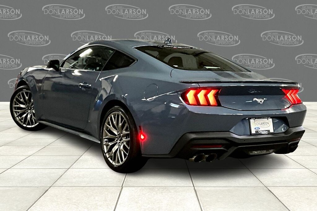 Vapor Blue Metallic 4-Wheel Disc Brakes, ABS brakes, Air Conditioning, Alloy wheels, AM/FM Stereo, Auto High-beam Headlights, Automatic temperature control, Brake assist, Bumpers: body-color, Compass, Delay-off headlights, Driver door bin, Driver vanity mirror, Dual front impact airbags, Dual front side impact airbags, Electronic Stability Control, Emergency communication system: 911 Assist, Exterior Parking Camera Rear, Four wheel independent suspension, Front anti-roll bar, Front Bucket Seats, Front Center Armrest, Front dual zone A/C, Front reading lights, Fully automatic headlights, Illuminated entry, Internet access capable: FordPass Connect, Knee airbag, Leather Shift Knob, Low tire pressure warning, Occupant sensing airbag, Outside temperature display, Overhead airbag, Overhead console, Panic alarm, Passenger door bin, Passenger vanity mirror, Power door mirrors, Power steering, Power windows, Radio data system, Rain sensing wipers, Rear anti-roll bar, Rear Parking Sensors, Rear window defroster, Remote keyless entry, Speed control, Speed-sensing steering, Speed-Sensitive Wipers, Split folding rear seat, Sport steering wheel, Steering wheel mounted audio controls, SYNC 4, Tachometer, Telescoping steering wheel, Tilt steering wheel, Traction control, Trip computer, Variably intermittent wipers, Voltmeter, Wheels: 18" x 8" Painted Shadow Silver Cast Alum. 21/32 City/Highway MPG 2026 Ford Mustang EcoBoost Premium RWD 10-Speed Automatic EcoBoost 2.3L I4 GTDi DOHC Turbocharged VCT
